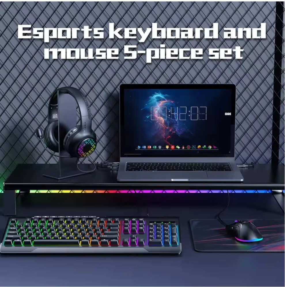 This 5 in 1 Combo features a wired gaming keyboard with RGB backlighting, offering vibrant rainbow lighting effects and a full-size 87-key layout. Designed for both office and gaming use, it provides versatility for laptop, desktop, or PC setups. The ABS plastic construction ensures durability, while the included wrist support enhances comfort during long hours of use.